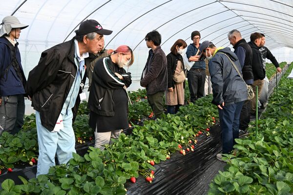 早瀬さんのハウスを見学する生産者たち=8日午後、真岡市