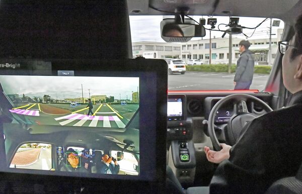 システム(右上)が危険を予測するとダッシュボードのランプが赤く光る。左はシステムが捉えた映像=22日午後、芳賀町役場