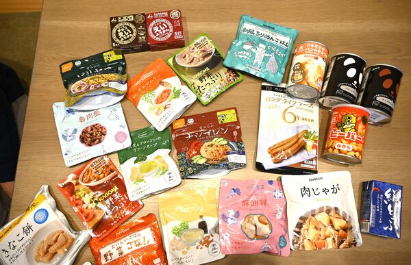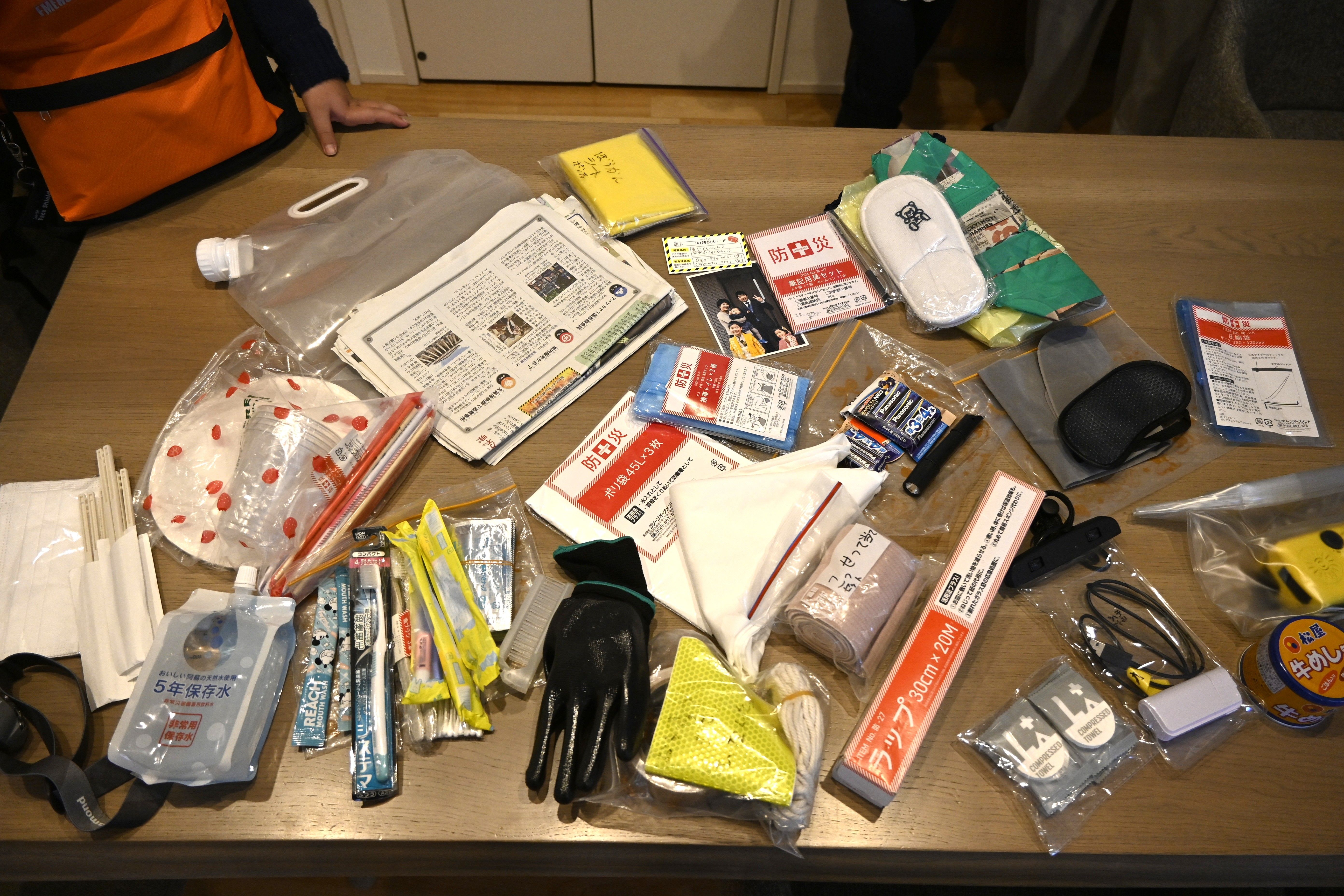防災リュックを広げる蒼さん。基本のセットに必要な物を足しています
