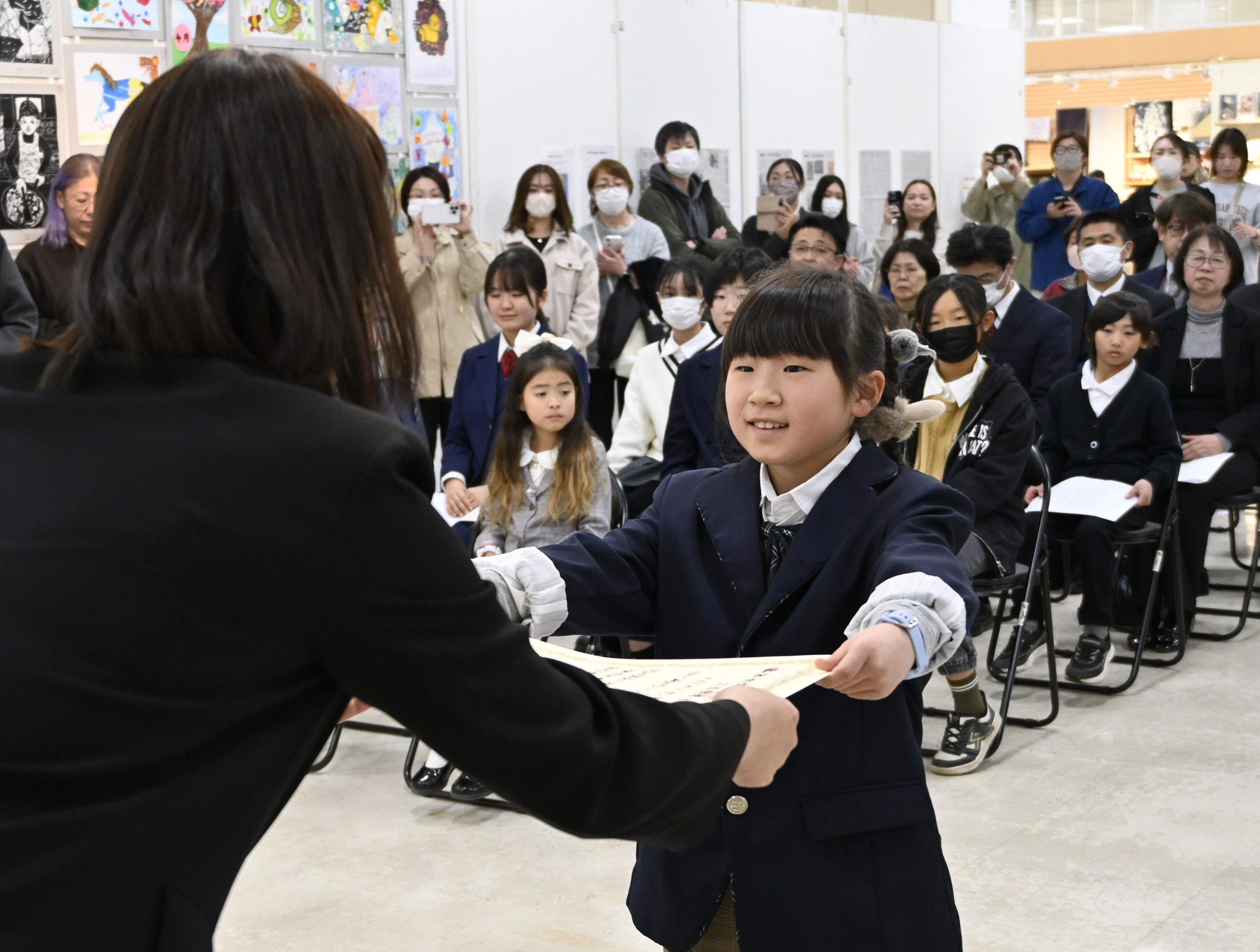 賞状を受け取る下野教育美術展小中学校の部の上位入賞者=20日午後、宇都宮市インターパーク6丁目