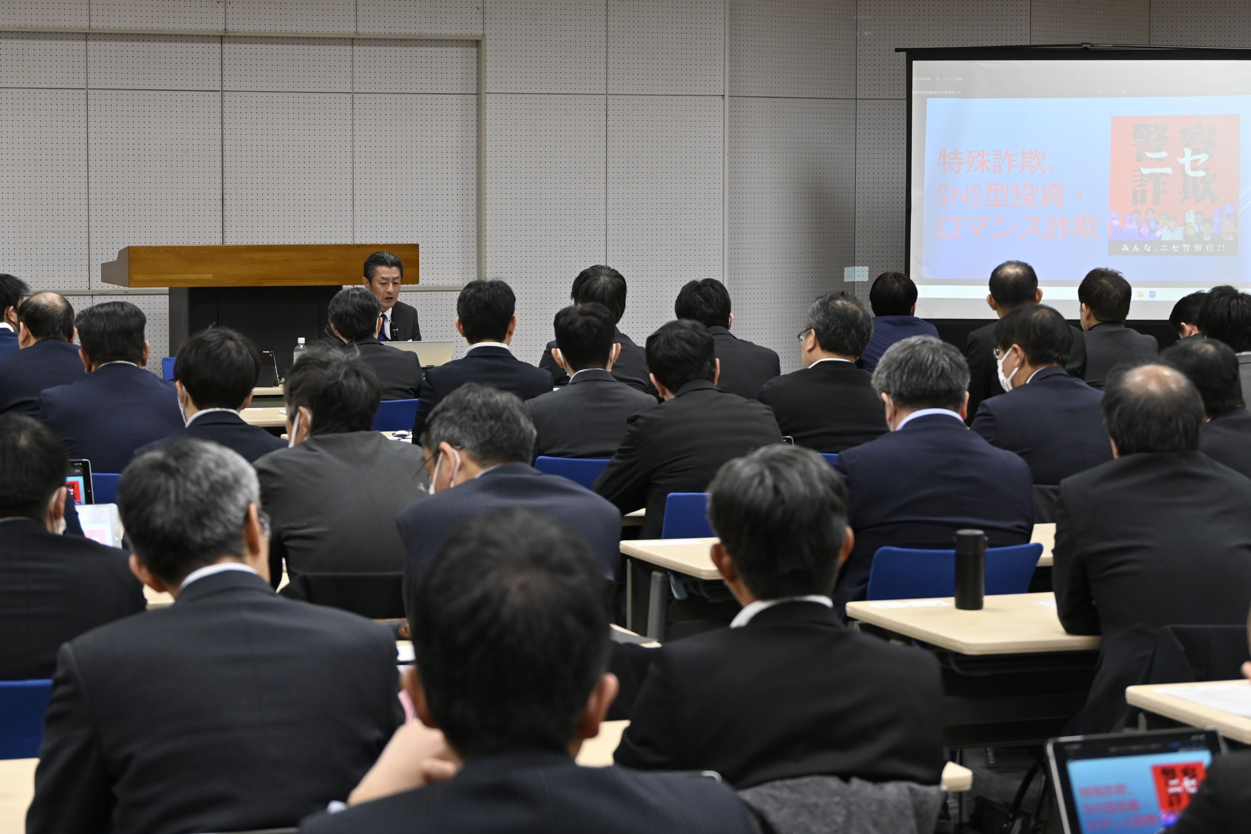 県警の担当者が特殊詐欺の手口などを説明した研修=20日午前、宇都宮市