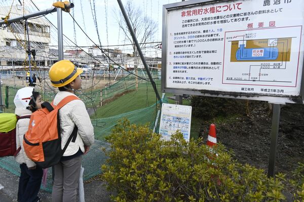 非常用貯水槽の看板を確認する蒼さん兄妹。日頃から地域に目を向けています