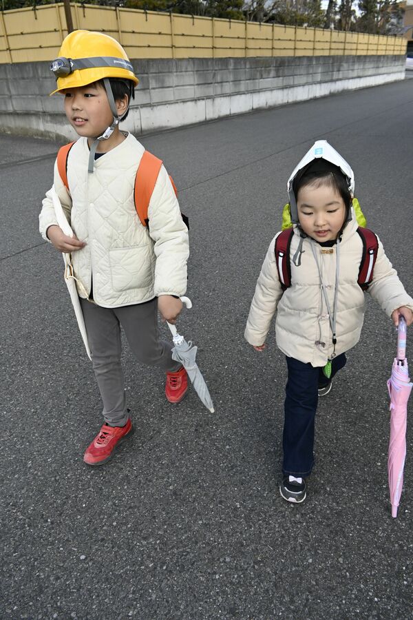 傘をつえのようにして足元を確かめながら歩く蒼さん(左)と英ちゃん