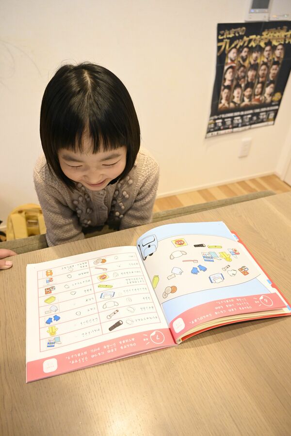 防災リュックの準備で参考にしたワークブックを広げる英ちゃん