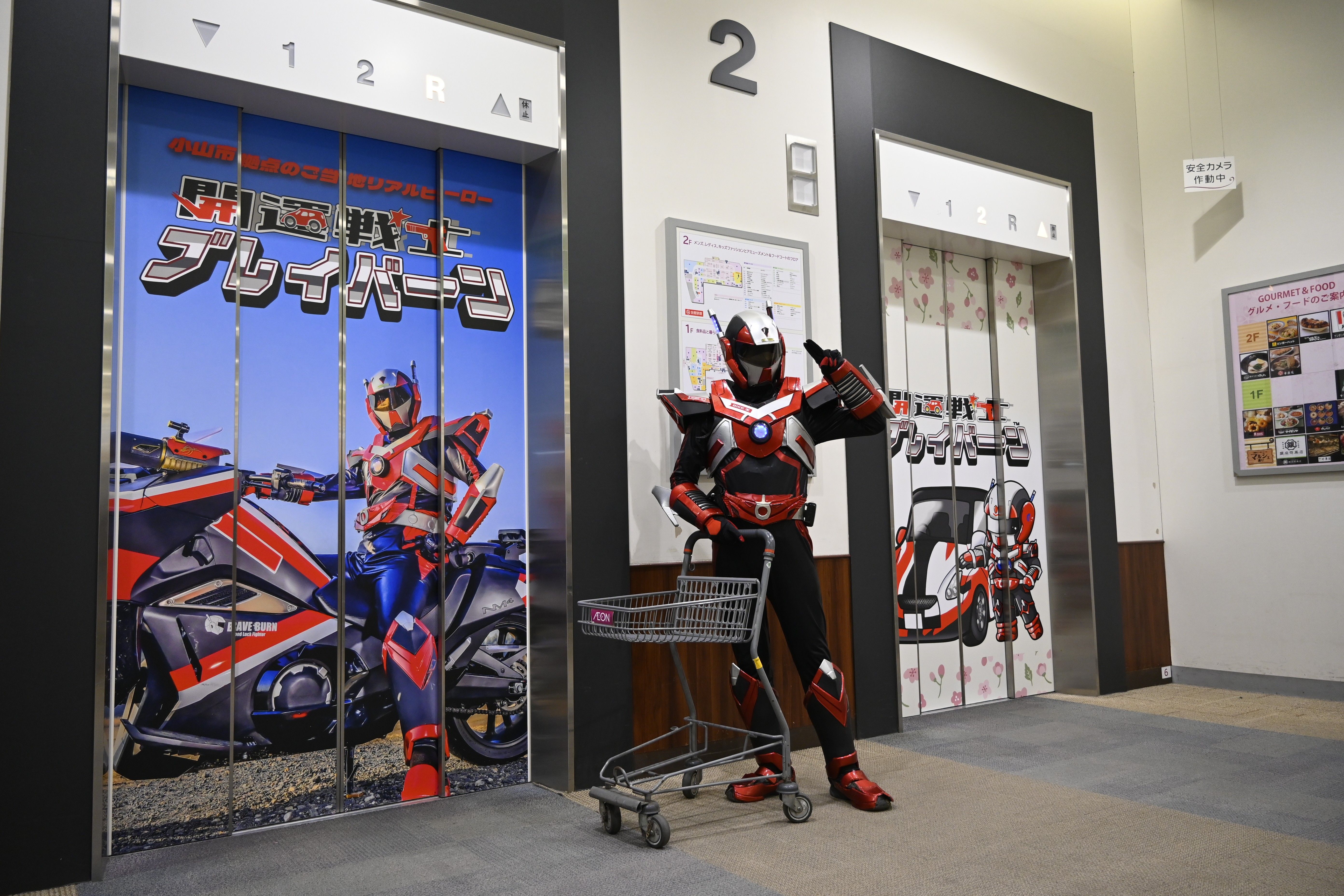 ラッピングされたエレベーターの前でポーズ を決めるブレイバーン(左)