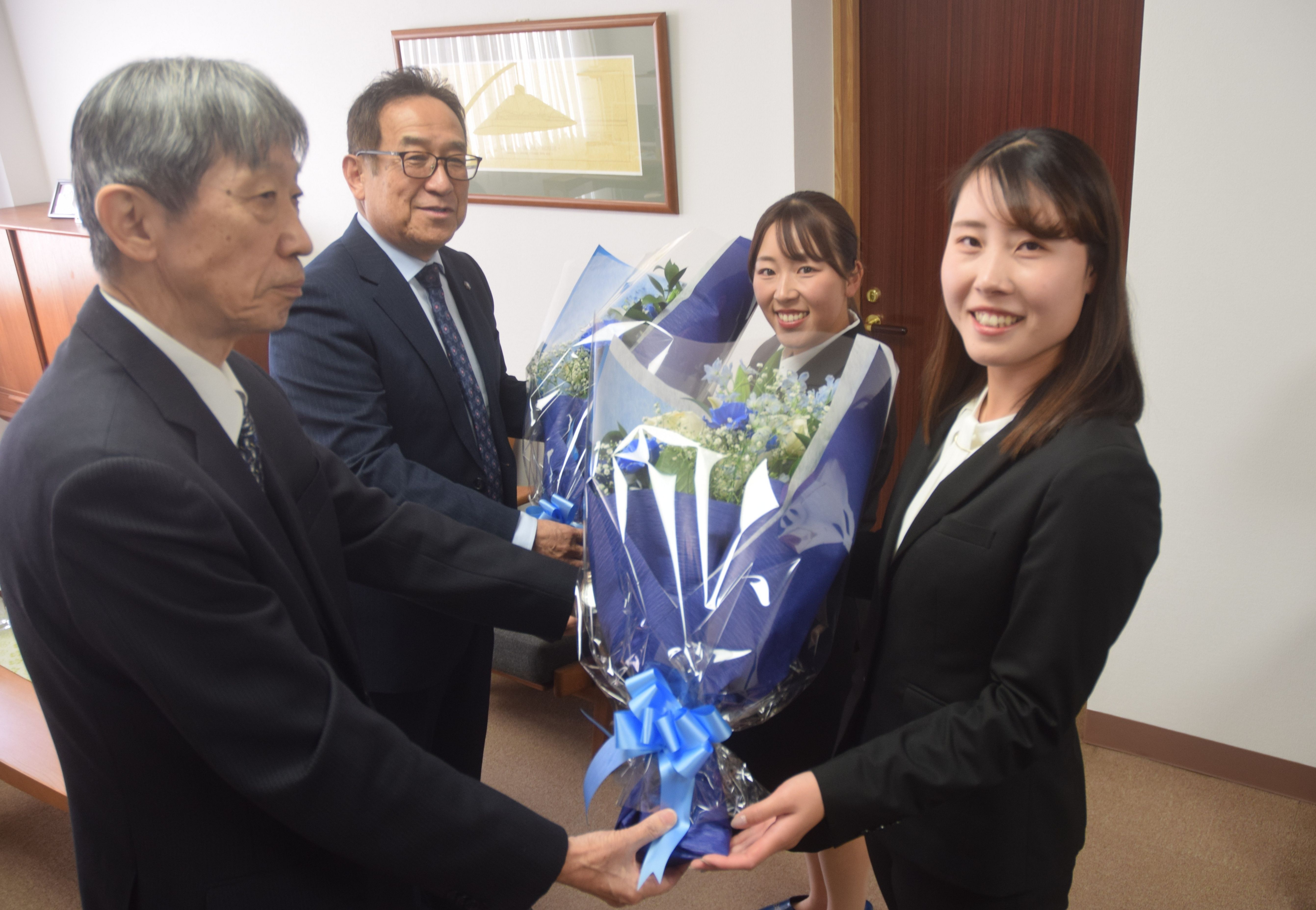 母校、宇都宮文星女子高で合格祝いの花束を受け取る横山(右端)と池羽(右から2人目)