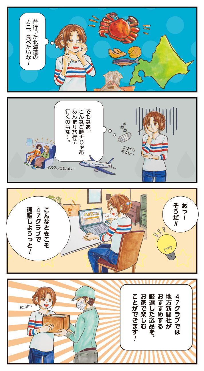 新型コロナウイルスの影響で、感染リスクがある中で積極的に観光地への旅行などを計画することが難しい状況です。外出しなくても、地方新聞社がお勧めする逸品を楽しむことができる、インターネット通販「47CLUB」を利用して、現地を体験しましょう。