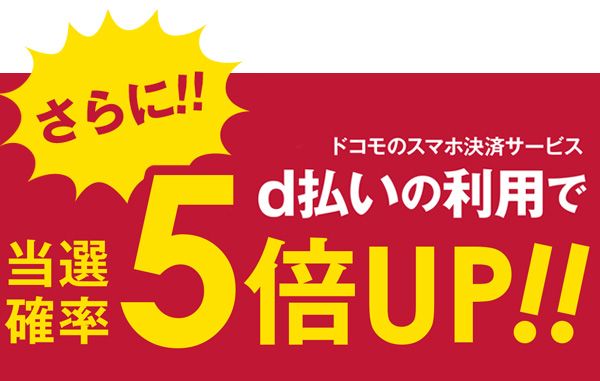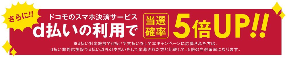 ※d払い対応施設でd払いで支払いをして本キャンペーンに応募された方は、d払い非対応施設でd払い以外の支払いをして応募された方と比較して、5倍の当選確率になります。