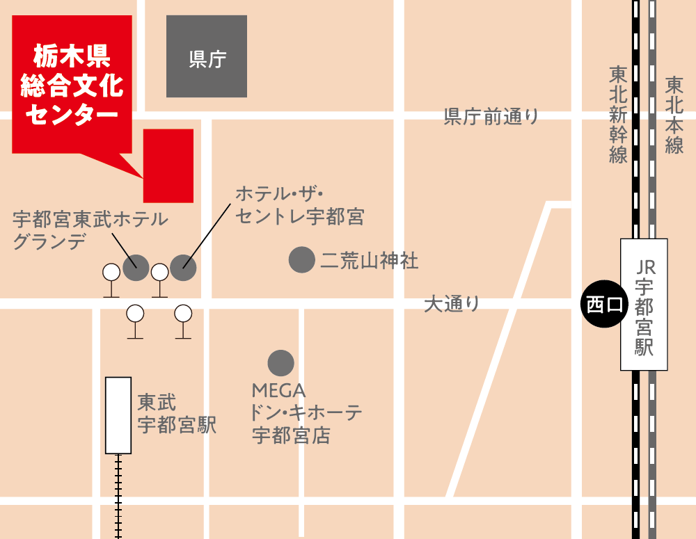 周辺の有料駐車場もしくは県庁地下駐車場をご利用ください。 詳しくは栃木県総合文化センターのホームページでご確認ください。 |